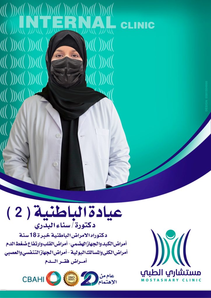 | الباطنية | عيادة الباطنة - 2 | د/ سناء البدرى | اخصائى باطنية - دكتوراة الامراض الباطنية | 18 عام | امراض الكبد والجهاز الهضمى - امراض القلب وارتفاع ضغط الدم - امراض الكلى والمسالك البولية - امراض الجهاز التنفسى والعصبى - امراض فقر الدم |