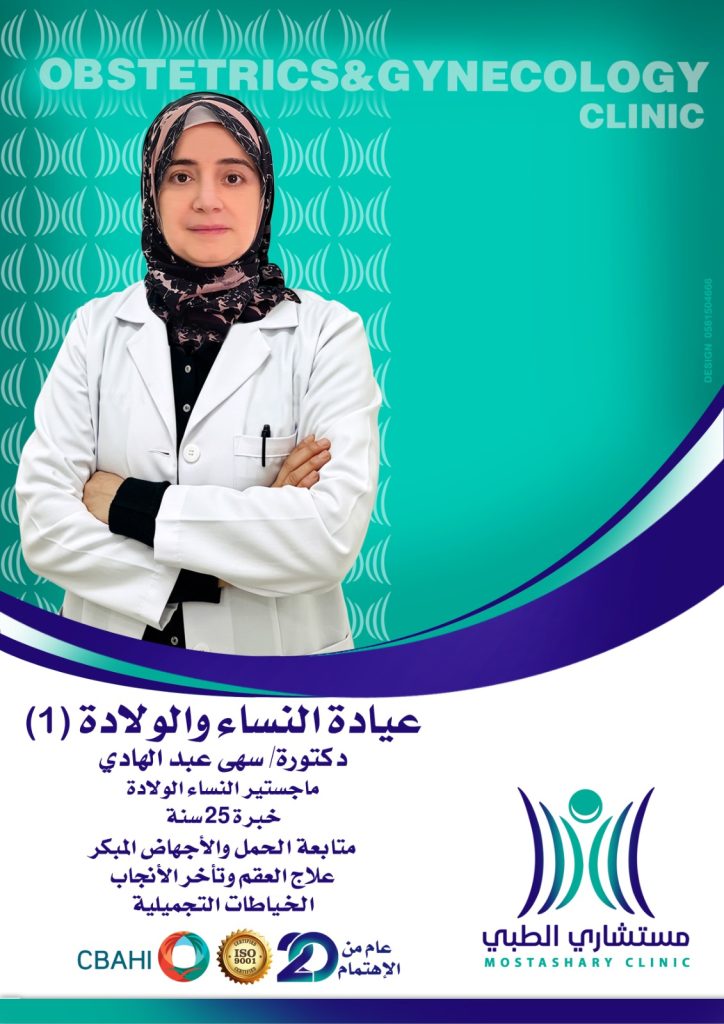 | النساء والولادة | عيادة النساء والولادة - 1 | د/ سهى عبدالهادى | اختصاصى النساء والولادة | 25 عام | متابعة الحمل والاجهاض المتكرر -علاج العقم وتاخر الانجاب - الخياطات التجميلية |