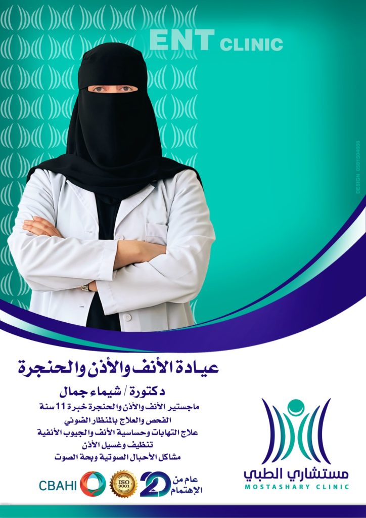 | الانف والاذن والحنجرة | عيادة الانف والاذن والحنجرة | د/ شيماء جمال | اختصاصى انف واذن وحنجرة - ماجستير في الانف والاذن والحنجرة | 11 عام | فحص وعلاج الانف والاذن والحنجرة بالمنظار الضوئي - علاج التهابات وحساسية الانف والجيوب الانفية - تنظيف وغسيل الاذن - مشاكل الاحبال الصونية وبحة الصوت |