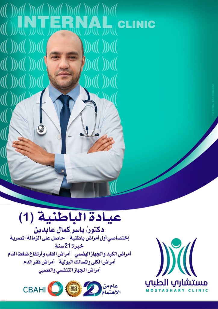 | الباطنية | عيادة الباطنة - 1 | د/ ياسر كمال عابدين | اختصاصى اول امراض باطنية - حاصل على الزمالة المصرية | 21 عام | امراض الكبد والجهاز الهضمى - امراض القلب وارتفاع ضغط الدم - امراض الكلى والمسالك البولية - امراض الجهاز التنفسى والعصبى - امراض فقر الدم |