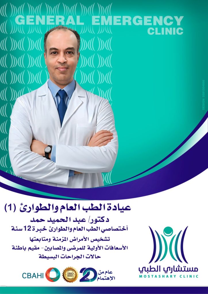 | الطب العام والطواريء | عيادة الطب العام والطواريء- 1 | د/ عبدالحميد حمد | طب عام وطب طواريء | 12 عام | تشخيص الامراض المزمنة ومتابعتها - الإسعافات الأولية للمرضي والمصابين - حالات الجراحات البسيطة |