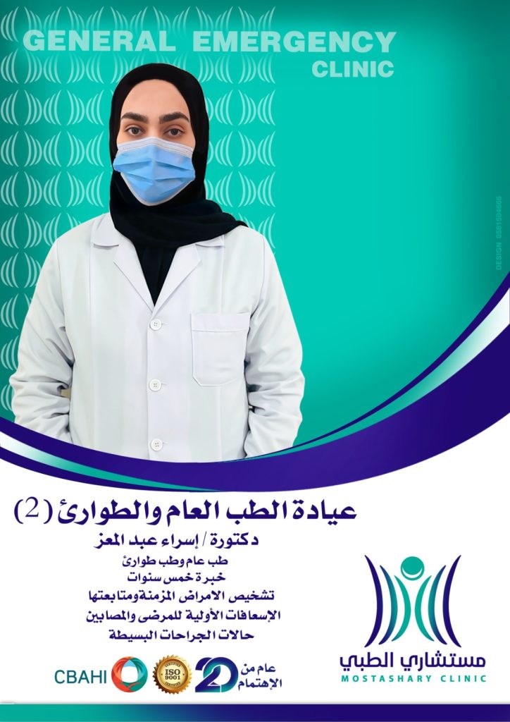 | الطب العام والطواريء | عيادة الطب العام والطواريء- 2 | د/ اسراء محمد | طب عام وطب طواريء | 5 سنوات | تشخيص الامراض المزمنة ومتابعتها - الإسعافات الأولية للمرضي والمصابين - حالات الجراحات البسيطة |