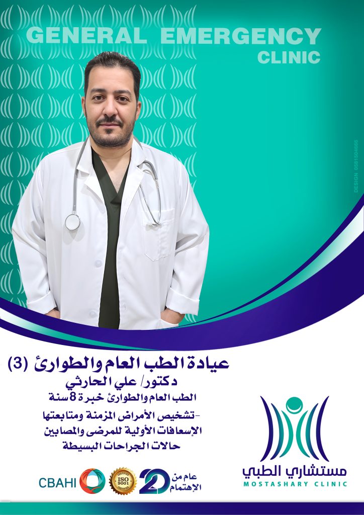 | الطب العام والطواريء | عيادة الطب العام والطواريء- 3 | د/ على الحارثى | طب عام وطب طواريء | 8 عام | تشخيص الامراض المزمنة ومتابعتها - الإسعافات الأولية للمرضي والمصابين - حالات الجراحات البسيطة |