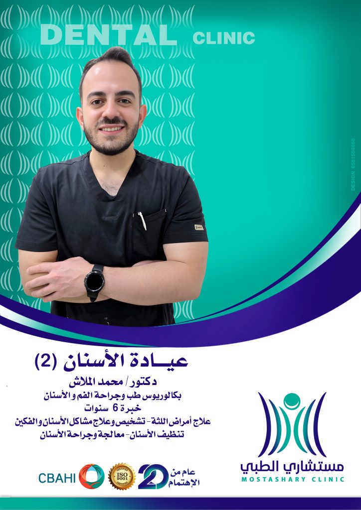 | الاسنان | عيادة الاسنان- 1 | د/ محمود عبدالرحمن | ماجستير تركيبات وزراعة الاسنان | 16 عام | زراعة الاسنان - تركيبات الاسنان الثابتة والمتحركة - عمل ابتسامة هوليود - تبييض الاسنان بالليزر |